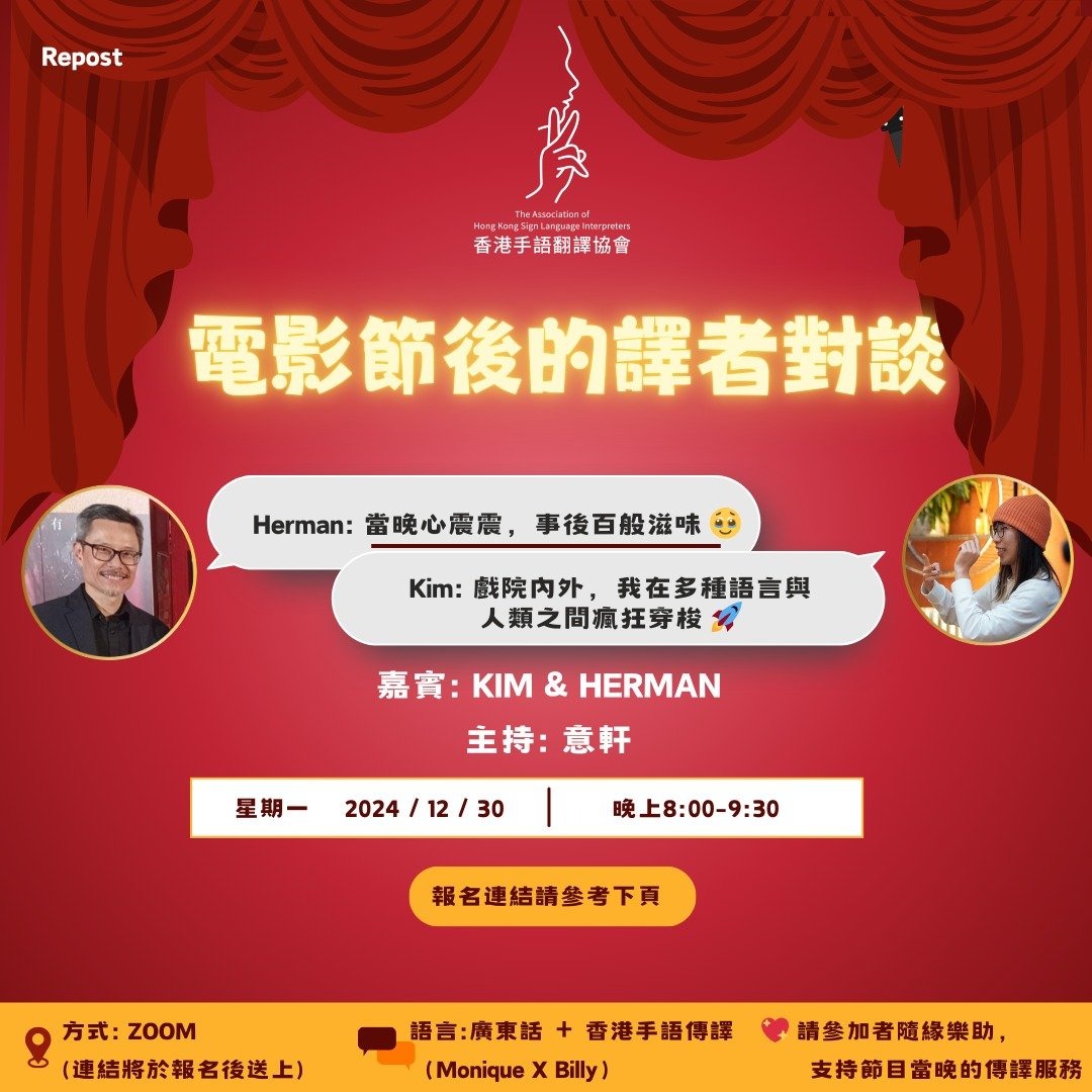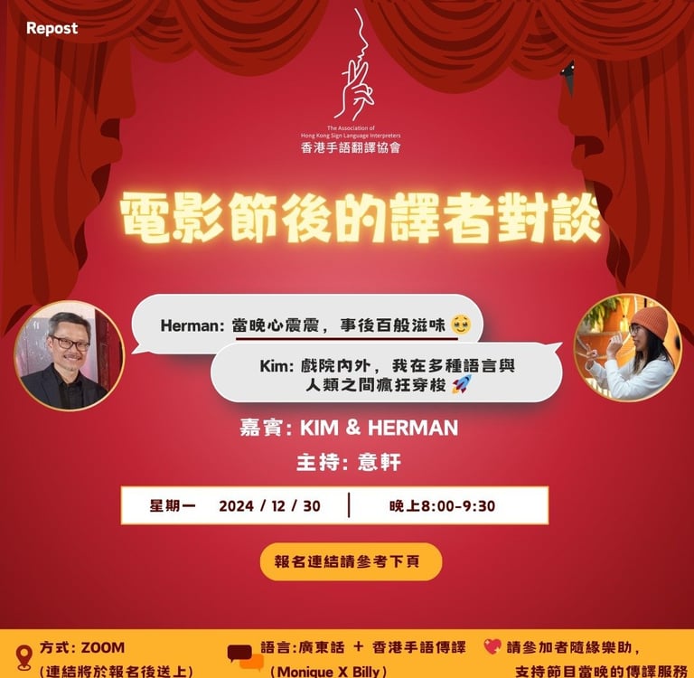 Join us for an insightful online conversation with interpreters Kim and Herman, who played pivotal roles at a recent film festival and a Taiwan movie Awards. Representing a recent movie, these interpreters juggled Cantonese, Hong Kong Sign Language, and multiple foreign languages, connecting audiences, the media, and the film team with precision and passion.