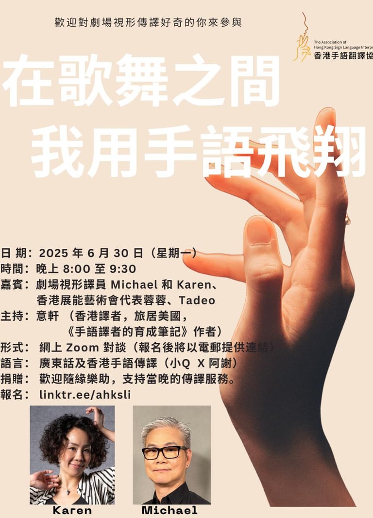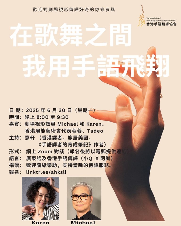 For the second online conversation of this year, we have invited Arts with the Disabled Association Hong Kong representatives, Yung Yung and Tadeo, Theatrical Interpreters Michael and Karen, to talk about the overall development of arts accessibility with the deaf community. If deaf people want to attend more mainstream performing arts, how should one build a path? How should arts administrators and frontline interpreters work together? How do interpreters create a signed version from a setlist of a concert? As a sign language interpreter who is also curious about Theatrical Interpreting, how do you know if you are the "right person"?