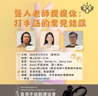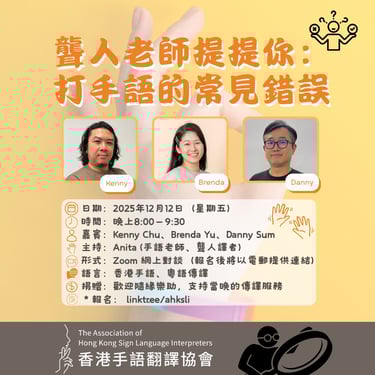 無論你是初學者、手語愛好者,還是準備投身翻譯工作的人士,又或單純想更了解聾人老師分享手語教學,這場對談絕對不容錯過。