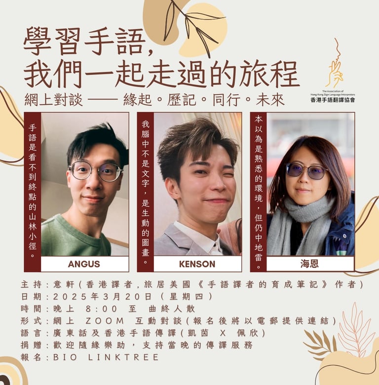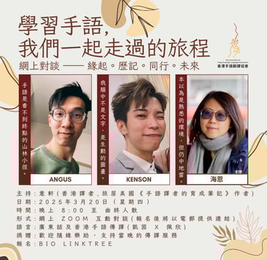 2025 首次對談,我們邀請了三位手語譯者 Angus、海恩、Kenson,分享他們學習手語的點滴。背景各異的他們,將暢談學手語的緣起、堅持之道,以及從學習手語到譯者的心路歷程。成為譯者,是否意味著回到原點,重新審視這門語言?