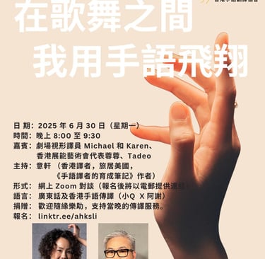 來到本年第 2 次網上對談,我們邀請了劇場視形傳譯員 Michael 和 Karen、香港展能藝術會代表蓉蓉、Tadeo,一起談談近年香港手語藝術通達的總體發展。如果聾人朋友想觀看更多主流表演藝術,路徑該怎樣搭建?藝術行政人員與前線譯者如何並肩協作?譯者又怎樣從一首首歌單開始藝術手語創作?作為手語譯者,而又對劇場視形傳譯好奇的你,又怎樣知道自己是那個「對的人」?